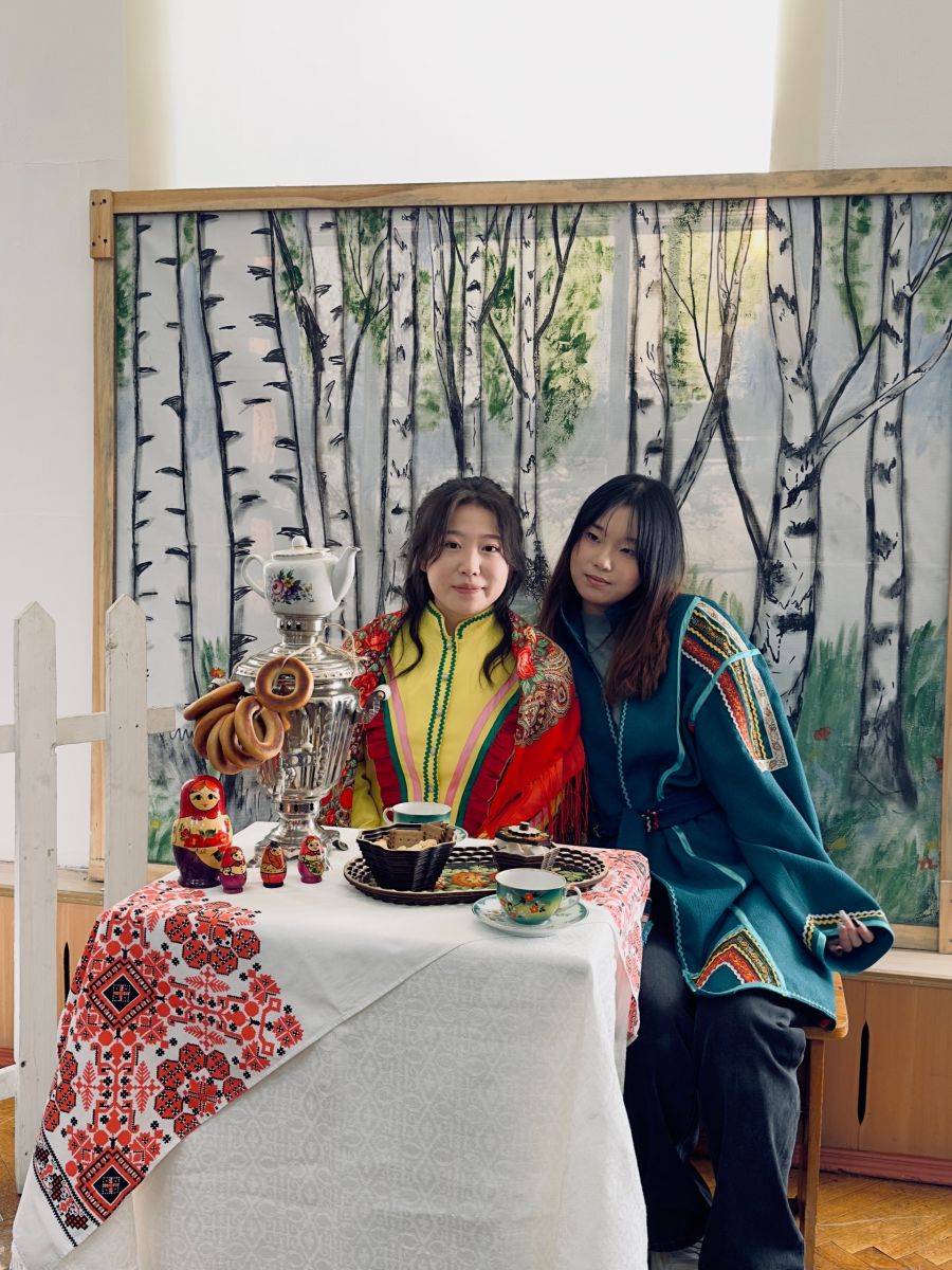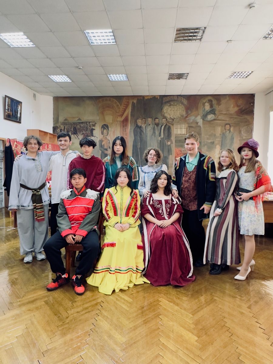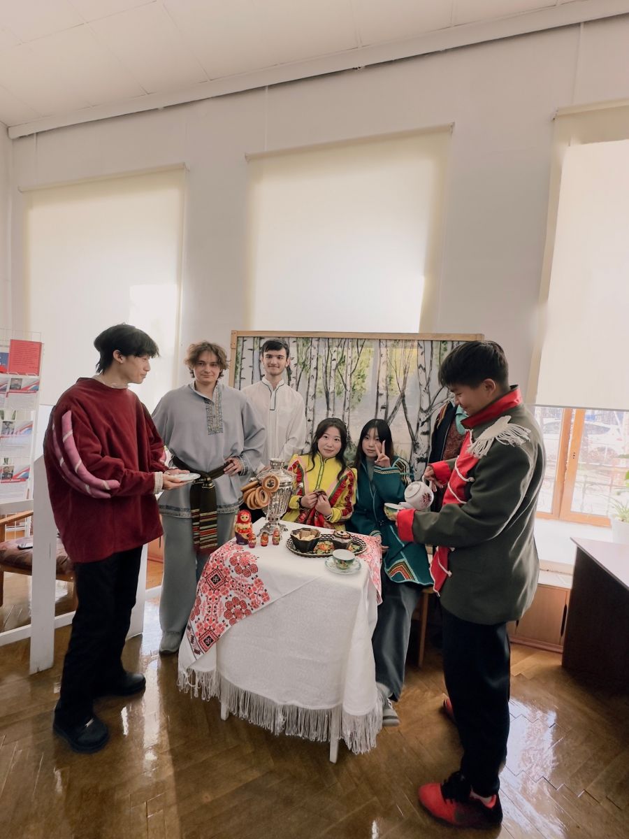 Насыщенной была встреча, подготовленная участниками литературного клуба «Театр книги». Иностранные гости посмотрели театрализованную студенческую мини-постановку, приняли участие в мастер-классе, попробовали русские блины, узнали о русских национальных играх и сами поиграли. Кроме того, студенты подготовили фотозону с российской атрибутикой – от старинных платков и самоваров до традиционной русской посуды и народных костюмов.