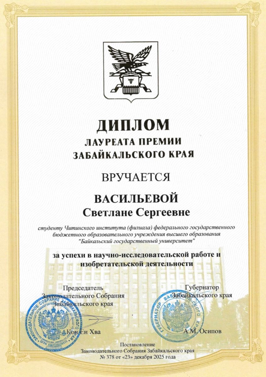 Студентка Читинского института БГУ стала Лауреатом премии Забайкальского края